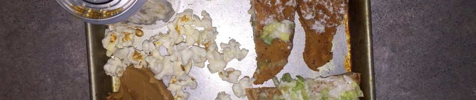 “Anyway, so, yeah, I decided to make my own spin on barbecue, which was basically cutting up and deconstructing a McChicken and putting it on the dirty pan, much like I would were I serving a cranky child. The popcorn’s tasty and made in a microwave, and the peanut butter’s like a garnish or something, I don’t know.”