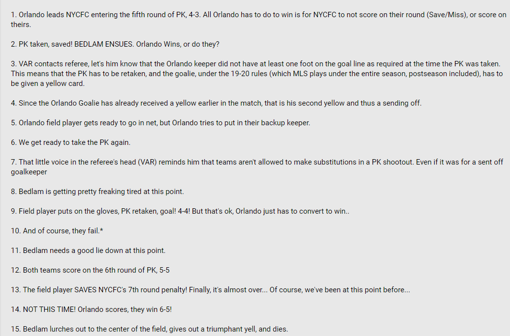 Orlando thought they had won like three times before they actually finally did win, they had to put in a left back at goal, and that left back actually made a save, which was even more ridiculous than the fact that he was back there to begin with, and Orlando ended up winning their first ever playoff game after six seasons of trying in the most beautifully stupid manner I’ve ever seen.