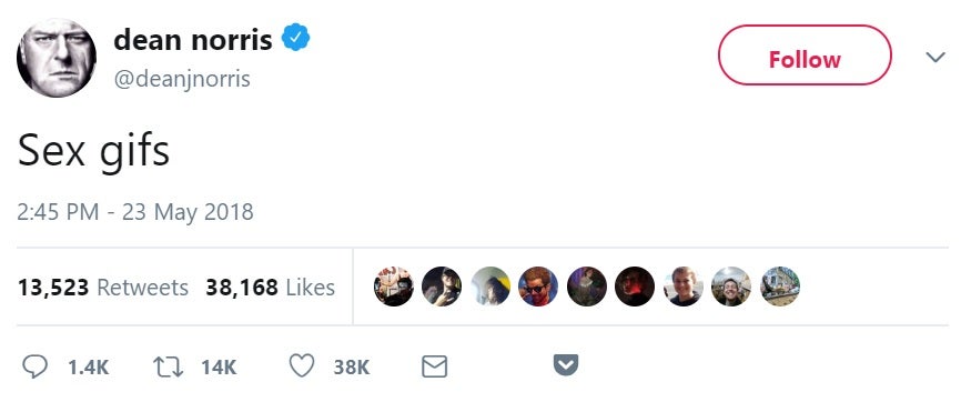 I love this conversation, first that Dean Norris would come to John Lurie under false pretenses to try to hit on the cousin from Stranger Than Paradise, also love that John Lurie, in response, lies to him, because Balint would’ve been like in her late forties in 2013. She won’t be 65 for like another ten years. That’s public information on Wikipedia that Dean could’ve looked up. Just wonderful. Two actors from completely different spheres coming together. This is one of the ideals of what Twitter was meant to be, I think. Dean is one of the men who uses Twitter well, infamously using it once when he himself was “choking the alligator”